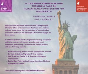 Join Episcopal Migration Ministries and The Episcopal Church‘s Office of Government Relations for a webinar on Thursday, April 8, from 4:00 – 5:00PM ET, to learn more about the current state of humanitarian protection and ways the Episcopal Church can engage on these issues.