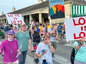 There was a float, and The Right Reverend Shannon Rogers Duckworth, Bishop of EDOLA, marched with several other clergy and laypeople, decked out in clerical collars and rainbow colors, carrying signs and fans, and making visible and audible statements of the welcome extended to all by The Episcopal Church. (photo credit: G. Douglas Adams, https://neworleanspride.org/)