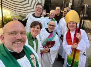 Gathered for the Pride Mass were: (front row) The Very Rev. Tommy Dillon II (rector of St. Margaret’s-Baton Rouge), The Rev. Allison Reid (rector of St. Anna’s), The Rev. Deacon Luigi Mandile, Bishop Shannon Duckworth, along with (back row) Zak Gillespie, The Rev. Deacon Ben Noble, Brother Don Dubay, and Ed Azemas, all members of St. Anna’s unless otherwise noted.