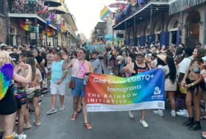 For Randy and KB Lovejoy, participating in the parade on behalf of RISA-NOLA was a powerful experience. Randy and one of their “migrant friends” carried the Rainbow Initiative banner, which proclaimed, “God Loves LGBTQ+ Immigrants.” The response to the banner from many spectators or participants was striking. As Randy recalled, “I heard a lot of people screaming, ‘Yes, He does!’ or ‘That’s me!’” — making it clear that the message on the banner resonated with them. “There was a lot of joy!”